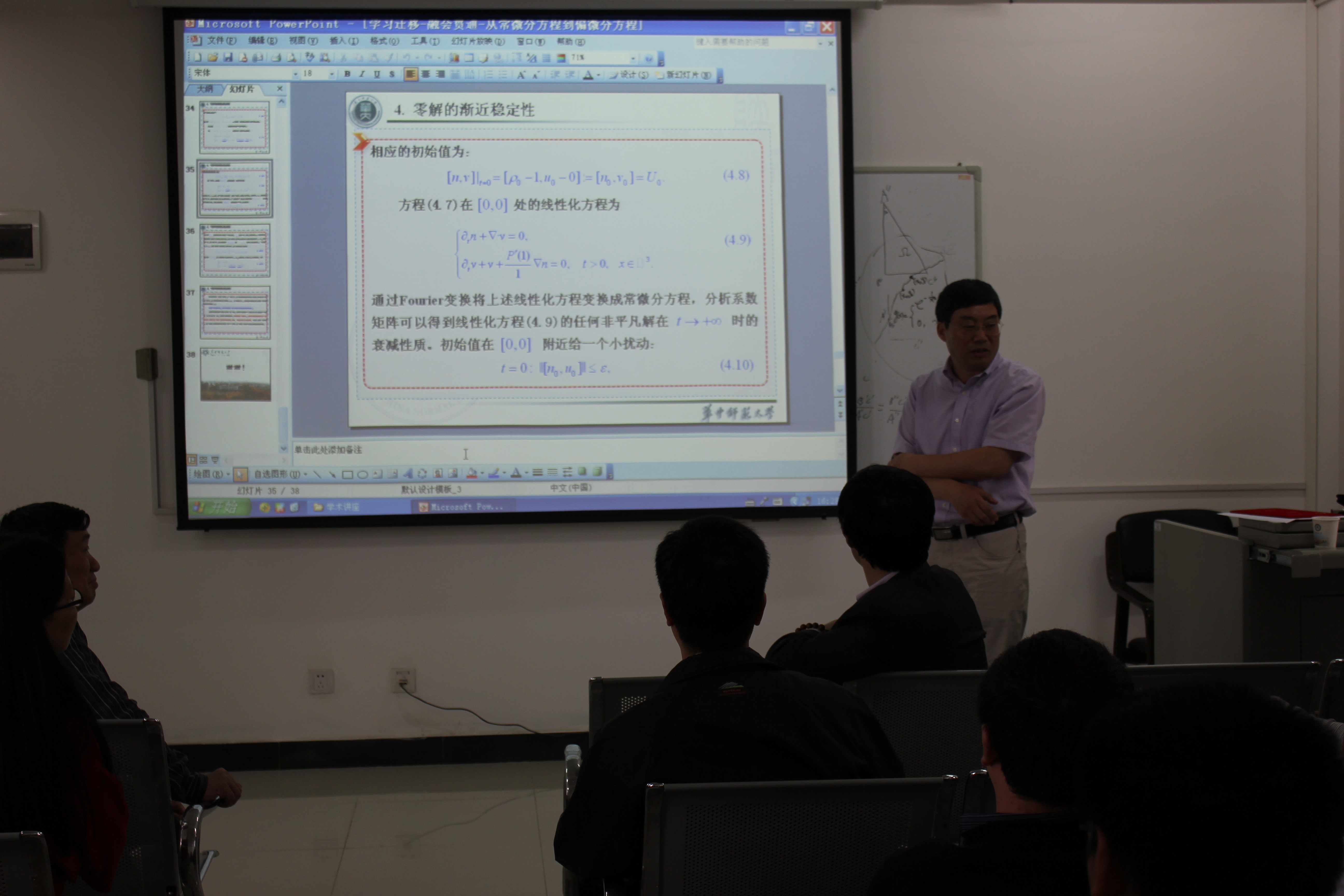朱教授首先简单介绍了常微分方程的一些经典结果和偏微分方程相应结果的比较,然后从局部解的存在性、从Cauclhy定理到Cauclhy-Kovalevskaye定理、解的延拓定理、零解的渐近稳定性这四个方面介绍了如何通过类比迁移,从常微分方程的解法过渡到偏微分方程的相应结果的研究中。整场报告中朱教授运用具体的实例,深入浅出的讲解赢得了师生们的满堂喝彩,师生们纷纷表示受益匪浅。会后,员工踊跃提问,与朱教授进行了良好的互动,现场气氛活跃。