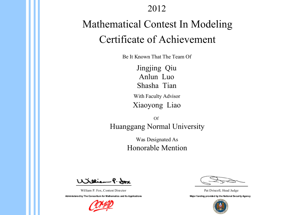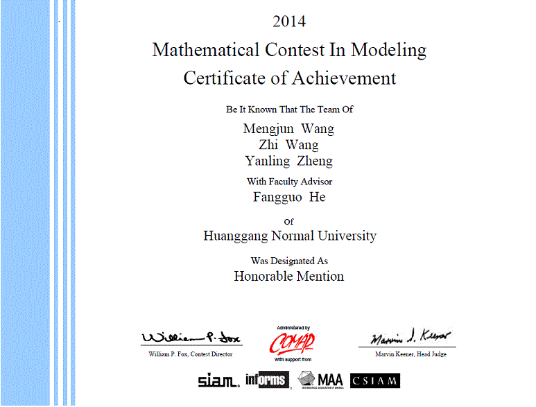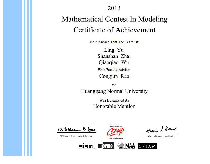 2011年,公司学子走出国门,走向世界,首次参加国际老员工数学建模竞赛(MCM/ICM),就获得一等奖1项、二等奖1项。2012年,公司员工再创佳绩,王珊、肖梅霞、赵吟薇获得一等奖,邱晶晶、罗安伦、田莎莎和邱亚豪、熊园园、宋婷分别获得二等奖。2013年获国际老员工数学建模竞赛二等奖1项、华中地区二等奖2项。2014年荣获国际老员工数学建模竞赛二等奖1项,全国老员工数学建模竞赛二等奖1项、三等奖5项,华中地区数学建模竞赛二等奖1项、三等奖3项。2015年荣获国际老员工数学建模竞赛二等奖1项,第8届华中地区老员工数学建模竞赛三等奖2项。现在,数学建模实践活动已成为彰显公司员工课外科技活动的一道靓丽风景。