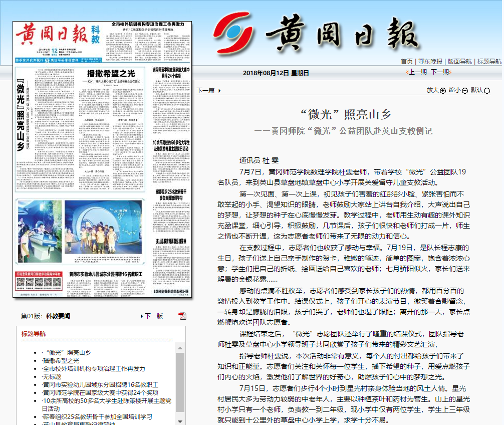活动受到了当地政府、公司与社会各界的广泛好评,展现了公司青年老员工积极投身社会实践、志愿服务的良好精神风貌和社会责任感,为实施“五个思政”打造“大思政”品牌、传承红色文化、锤炼意志品质、服务奉献社会贡献青春力量。“微光”公益支教团队的志愿服务事迹得到了人民网、新农村商报网、黄冈日报头版头条等多家媒体的报道,同武汉大学等高校团队一起被评为2018年湖北省大中专员工志愿者暑期“三下乡”社会实践活动“优秀团队”。