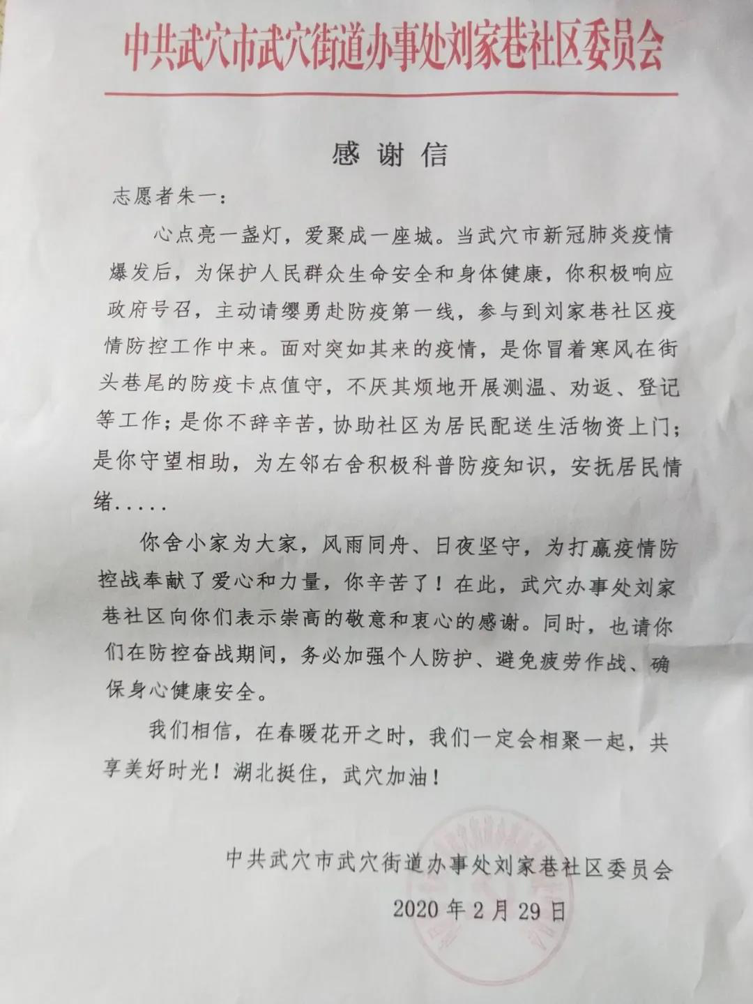 临危受命,从容中显担当。1月26日,武穴市开始封城。朱一同学因参加雅思考试于1月18日自武汉返回,在自我隔离28天后,主动请缨,向武穴市刘家巷社区防控小组申请要求加入志愿者行列。2月19日去社区报到,当天下午就正式投入了防疫工作。20日,因一领导干部要下沉镇上村湾,于是朱一同学全面接手前者的工作——