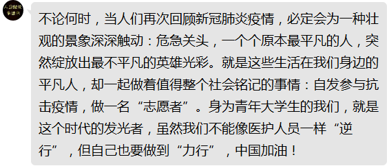 就 “如何看待此次疫情中的逆行者?与面临此次疫情对我们的启示,我们可以为社会为国家做些什么?”同学们展开了积极讨论。在疫情期间要树立责任意识,要有更高的自我约束能力,强烈的社会责任感,在未来的一段日子里,做周围人的榜样,为打赢新型冠状病毒肺炎疫情防控阻击战贡献力量。