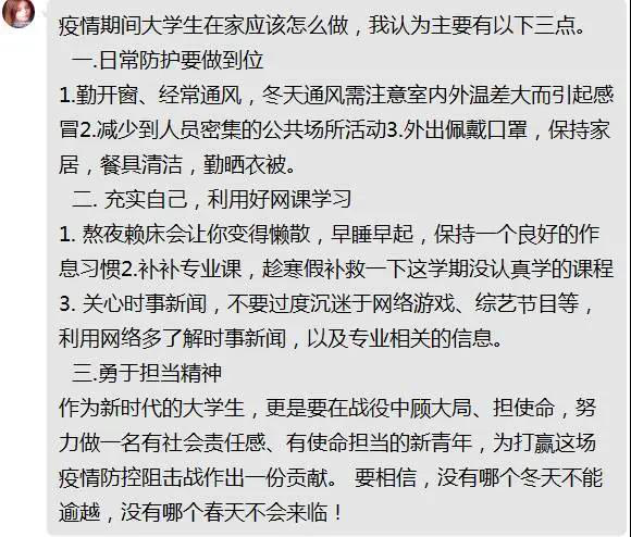 最后班主任在总结中强调,同学们经历了此次疫情,一是要深刻认识中国特色社会主义制度的强大优越性,相信中国共产党一定能。二是要积极参与到所在地疫情防控工作中去,向身边的榜样学习,向“最美逆行者”学习,争做新时代的“雷锋”。三是要加强理论学习,树立正确世界观人生观价值观。班主任就疫情期间做好相关工作强调,一是要积极配合做好公司及所在地的疫情防控工作,及时报平安。从自我做起,不串门、不聚会;坚决做好相关防控措施,保护好家人;服从公司指挥安排,完成公司交办的工作任务;坚决不信谣不造谣不传谣;及时关注国家、公司疫情防控工作情况,为打赢疫情防控阻击战贡献自己的力量。二是充分高校利用好在家时间学习好网络课程,多做有意义的事情。三是今年突发疫情,和往年不同,从选公司、选方向、买资料、英语学习、专业课学习等方面鼓励同学们考研,并且做好充足的准备。