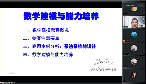 “大道行思,取则行远”。为不断追求更新的思考,持续积累更多的经验,出于对疫情防控的全面考虑与国赛在即的迫切心境,应于教导处及公司领导的大力支持和同学们求知若渴的学习热情,9月4日上午9:00,武汉大学羿旭明教授受邀公司进行数学建模线上讲座。