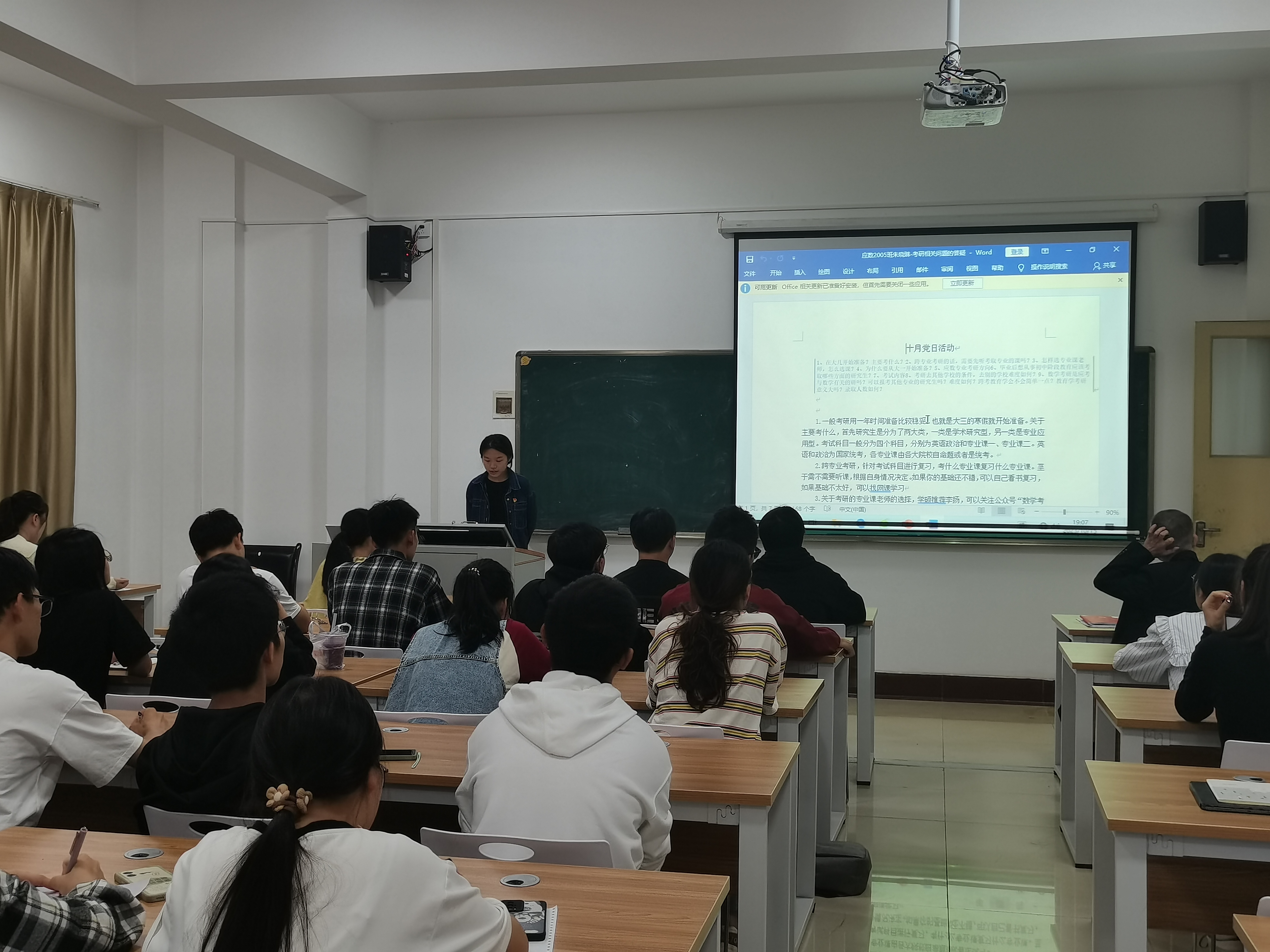 首先主持人焦学胜同学介绍了本次活动的前期准备、内容和流程。接着由员工第三党支部支委梅方莹同志组织党支部党员同志结合自身经历从考研、专业课程与选修课程学习、社团、担任班干、员工会、入团入党、英语四六级、计算机等级考试、第二课堂、志愿支教活动、就业、专业比赛项目等方面给新生介绍了有关要求,分享了学习经验。