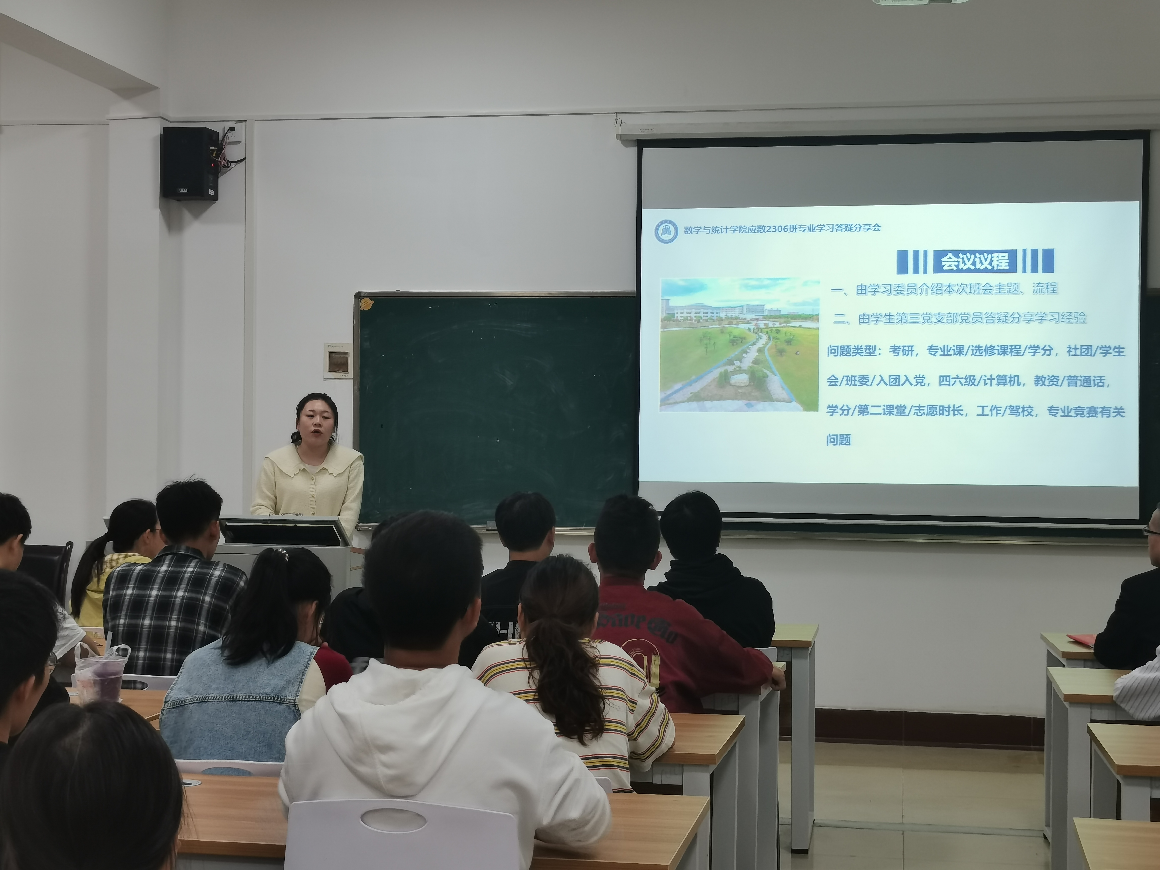 为推动学习贯彻习近平新时代中国特色社会主义思想主题教育活动走深、走实,2023年10月15日晚19:00,williamhill威廉希尔员工第三党支部走进数学与应用数学202306班召开了专业学习答疑分享会,帮助大一新生明确大学目标,充分调动学习积极性,有的放矢做好学业规划,加强学风建设。员工第三党支部书记、班主任吴卫兵老师参加了此次活动,班会由员工第三党支部支委梅方莹同志和数学与应用数学202306班学习委员焦学胜同学联合主持。