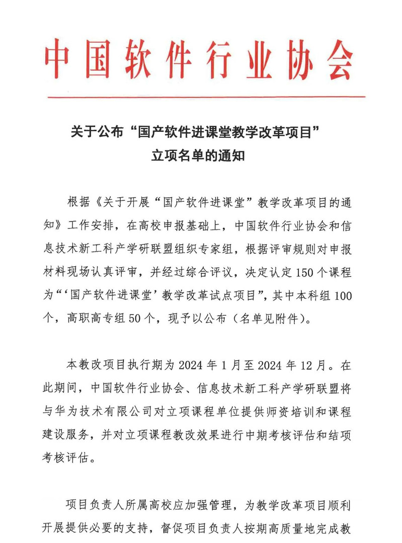 近期,中国软件行业协会发布了2023年“国产软件进课堂”教学改革项目立项名单,共有150个课程入选,其中本科组100个。公司肖加清老师主持的项目《HCIA-Big Data V3.5》获批立项。此次立项,是学院推进数据科学与大数据技术专业应用型人才培养所取得的突破性进展,进一步推进产教深度融合。