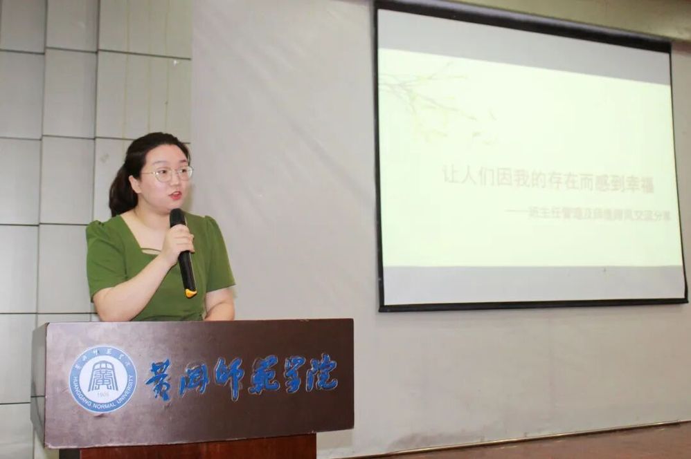 会议第二项议程,由黄冈市明珠公司肖媛老师作班级管理的专题报告。肖媛老师从“做什么样的老师/班主任”、“培养什么样的员工”、“班级管理巧用力”三个方面交流了自己从事班级管理工作的心得体会,用自己的亲身经历为同学们抛砖引玉,总结出扎实的教学能力、改变心态、广泛阅读成为杂家、师生合作指定班级规章制度、严慈相济善于沟通、教育写作等六个班级管理技巧。