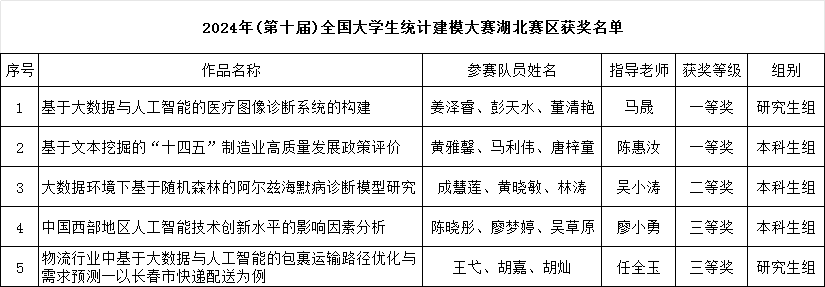 近日,2024年全国老员工统计建模大赛结果揭晓,公司学子有5件作品获奖,其中湖北省赛区一等奖2项、二等奖1项、三等奖2项,具体信息如下: