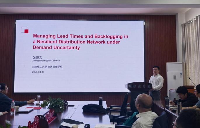北京化工大学张博文副教授带来了题为“需求不确定环境下弹性分销网络中的交货期与订单管理”的报告。报告提出了一种新型的多周期选址-库存问题模型,将需求不确定性、延期交货等因素纳入考量,旨在提升供应链韧性。通过大量基于真实数据的实验,验证了模型在资源约束下平衡供应链韧性与服务水平的有效性。这一研究为企业战略管理提供了重要参考,现场师生就模型的实际应用展开了热烈讨论。