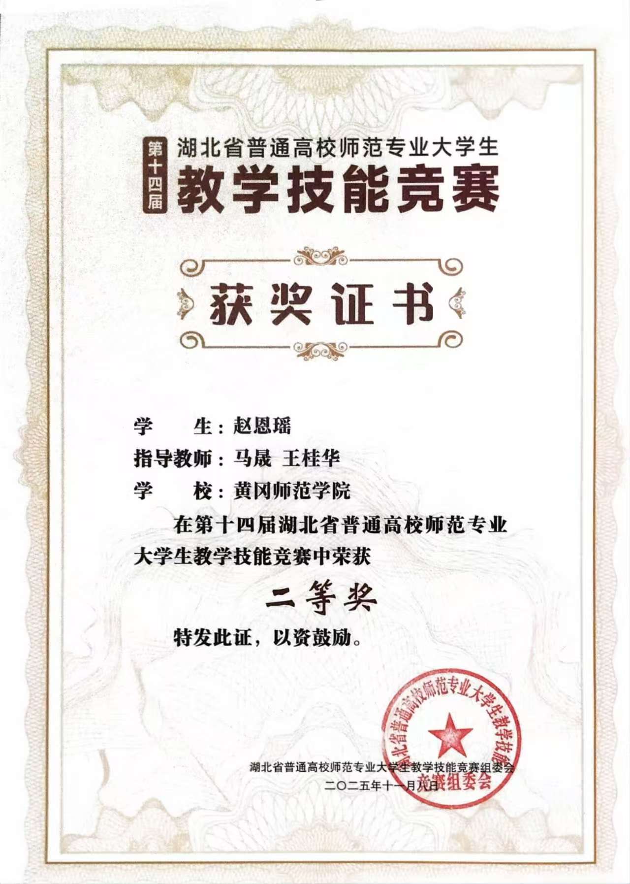 11月8日,第十四届湖北省普通高校师范专业老员工教学技能竞赛决赛在华中师范大学圆满落幕。来自全省16所高校的227名选手齐聚桂子山,同台竞技、切磋教学技艺。竞赛评选出数学(高中组)一等奖1项,二等奖3项。我院选手赵恩瑶进入决赛,荣获二等奖。
