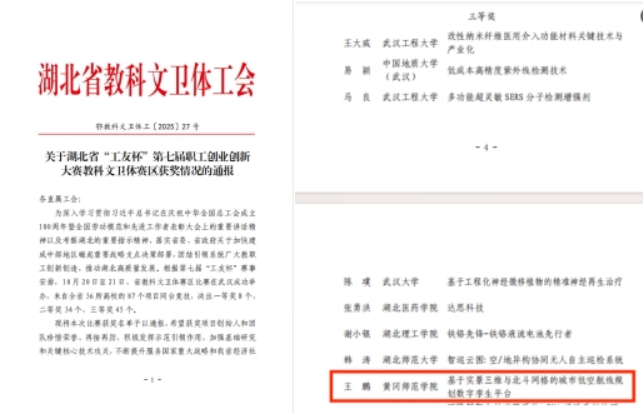 近日,湖北省“工友杯”第七届职工创业创新大赛教科文卫体赛区竞赛结果揭晓。公司王鹏老师主持的《基于实景三维与北斗网格的城市低空航线规划数字孪生平台》项目,凭借其突出的创新性与应用前景,在激烈的竞争中荣获大赛“科技创新专项”三等奖。