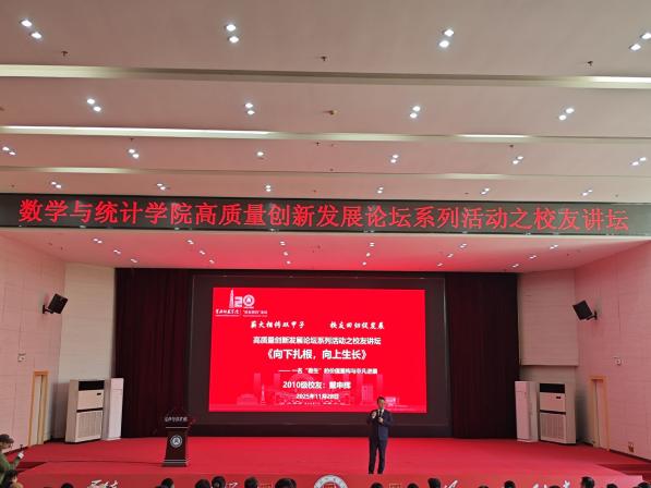 1128日下午,williamhill威廉希尔2010级员工、贵州东恒教育科技集团董事长戴申辉在南校区厚德楼学术交流中心,以《向下扎根,向上生长》为题为全院师生作了一场精彩的报告分享,以他成长道路的坚韧不拔和充满智慧的奋斗历程解锁从数统学子到教育培训行业领航者的成长密码。